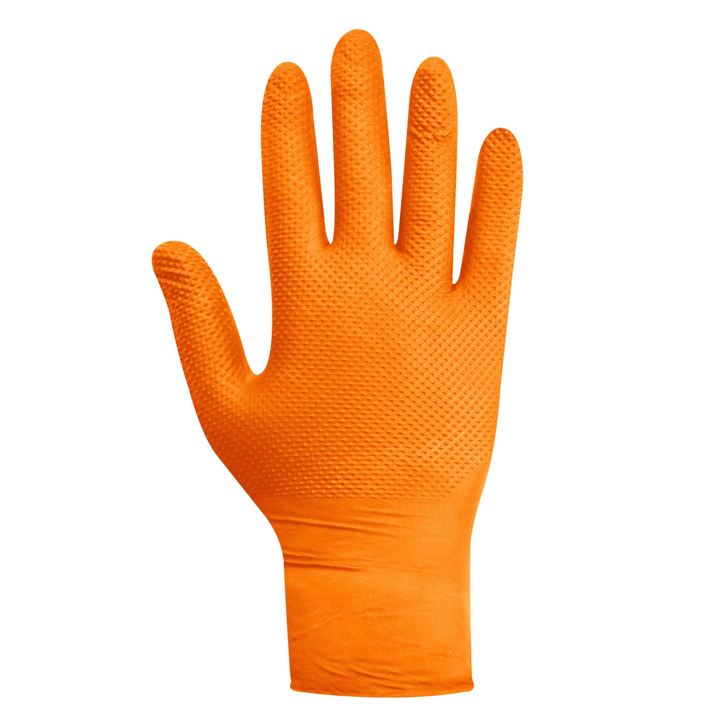 Guante de nitrilo naranjo texturizado diamantado de 8 gramos, diseñado para brindar alta resistencia, durabilidad y excelente agarre. Su color naranjo no solo aporta alta visibilidad, facilitando la detección de las manos en ambientes de riesgo, sino que también permite identificar rápidamente posibles roturas o daños en el guante, reduciendo así el riesgo de contaminación o accidentes. Gracias a su fabricación 100% en nitrilo y su textura antideslizante, ofrece un excelente agarre incluso en superficies húmedas o aceitosas. Ideal para la industria automotriz, faenas industriales, minería, talleres, limpieza pesada y manipulación de alimentos, este guante combina resistencia, seguridad y comodidad en una sola pieza. Además, cuenta con tecnología touch, permitiendo el uso de pantallas y dispositivos móviles sin necesidad de retirarlo. Su empaque individual es una caja de 100 unidades (50 pares).